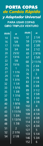 - Versatilidad: El empaque incluye una tabla detallada de equivalencias en milímetros y pulgadas para más de 50 opciones de diámetros .