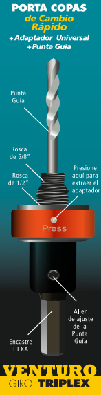 El Porta Copas de Cambio Rápido GT-PCR es un accesorio de la línea Venturo Giro Triplex diseñado para facilitar el uso de sierras copa de diferentes medidas de forma ágil y segura.