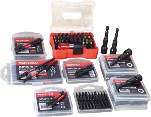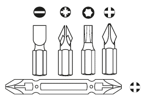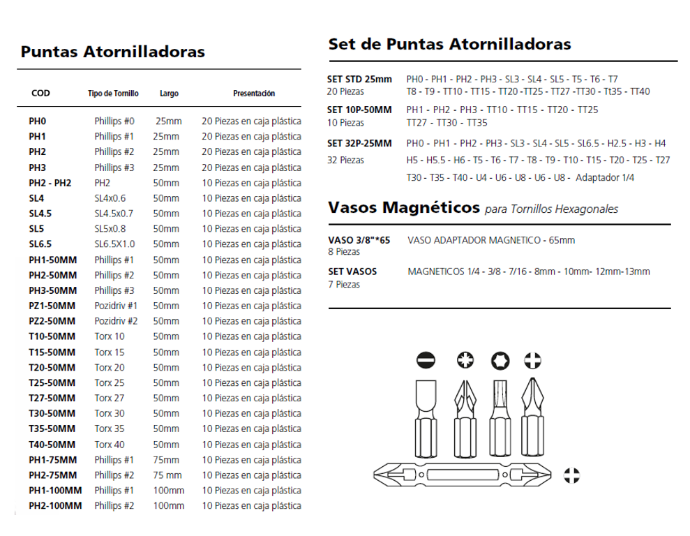 PH0 – PH1 – PH2 – PH3 – SL3 – SL4 – SL5 – SL6.5 – H2.5 – H3 – H4 H5 – H5.5 – H6 – T5 – T6 – T7 – T8 – T9 – T10 – T15 – T20 – T25 – T27 T30 – T35 – T40 – U4 – U6 – U8 – U6 – U8 – Adaptador 1/4 |
